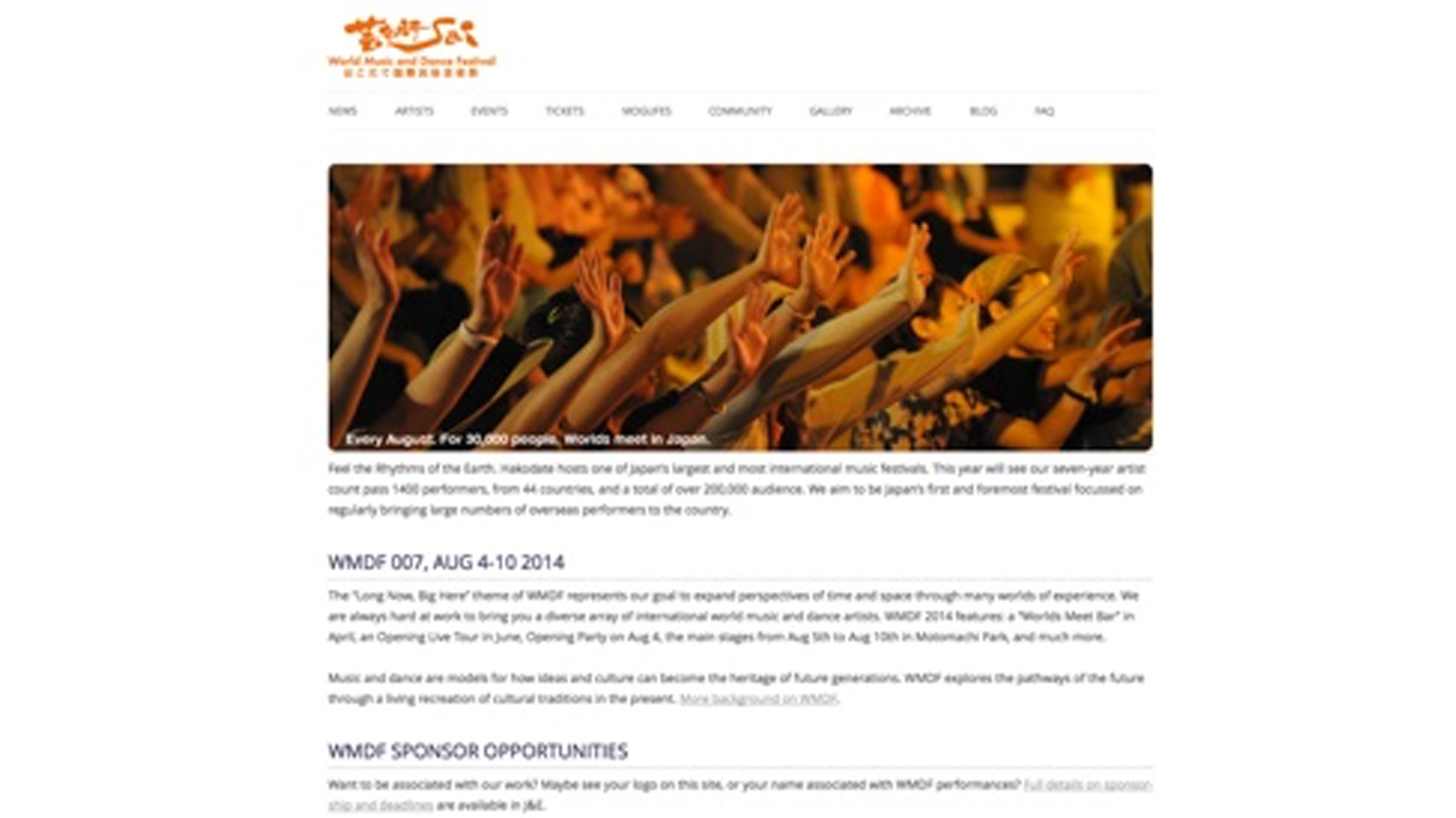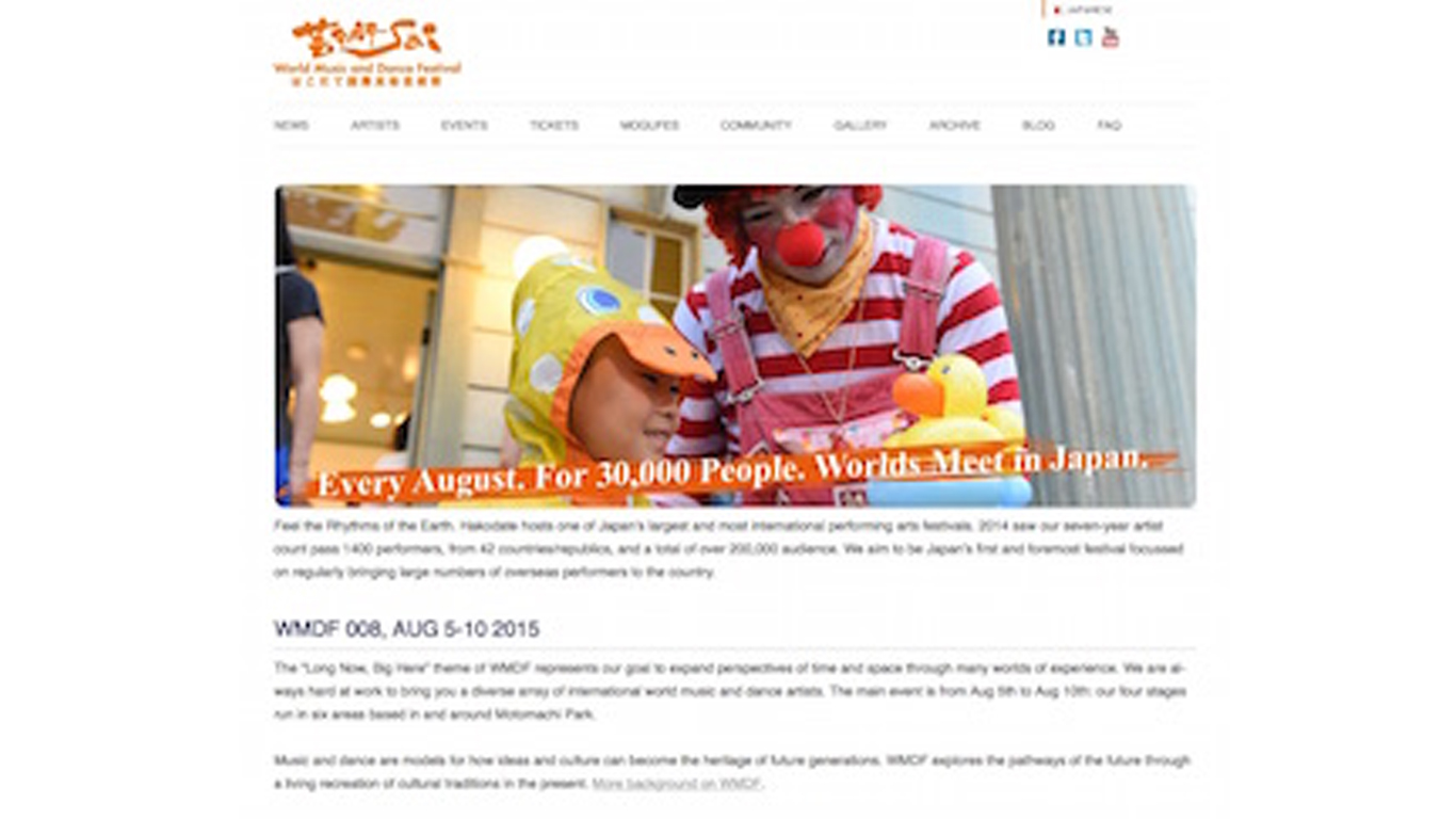 2007年8月。有志による組織委員会が結成され、「はこだて国際民俗芸術祭」開催に向けて活動をはじめました。出演者の来日交渉と招聘作業、元町公園の設営計画、そして運営に必要なスタッフの募集。すべてが初めての経験でしたが、地域の方々とすべての参加者に支えられて、無事に成功を収めました。すべての観客が総立ちとなり、民俗芸術の「世界」が会場に現れました。