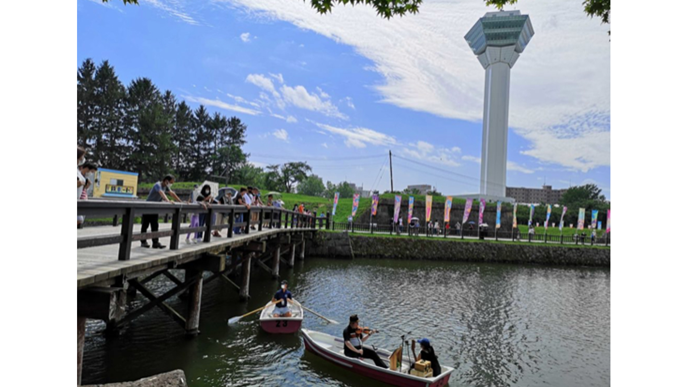 新型コロナウイルスの影響を受けた年。五稜郭公園で初めて「モーツ・アート」を開催しました。これは元町公園で行ってきたステージやもぐフェスの代わりとして生まれた取り組みです。会場にフラッグを設置し、25回にわたる手こぎボートでのライブパフォーマンスを実施。ライブ配信やオンデマンド動画、そして距離を保ちながらの観覧というハイブリッド型のイベントとなりました。舞台裏では、データベースソフトのAirtableを業務に取り入れ、運営も一段と効率化。さらに秋には七飯町の「男爵ラウンジ」とコラボし、2日間のイベント「どこでも芸術祭」を実現しました。