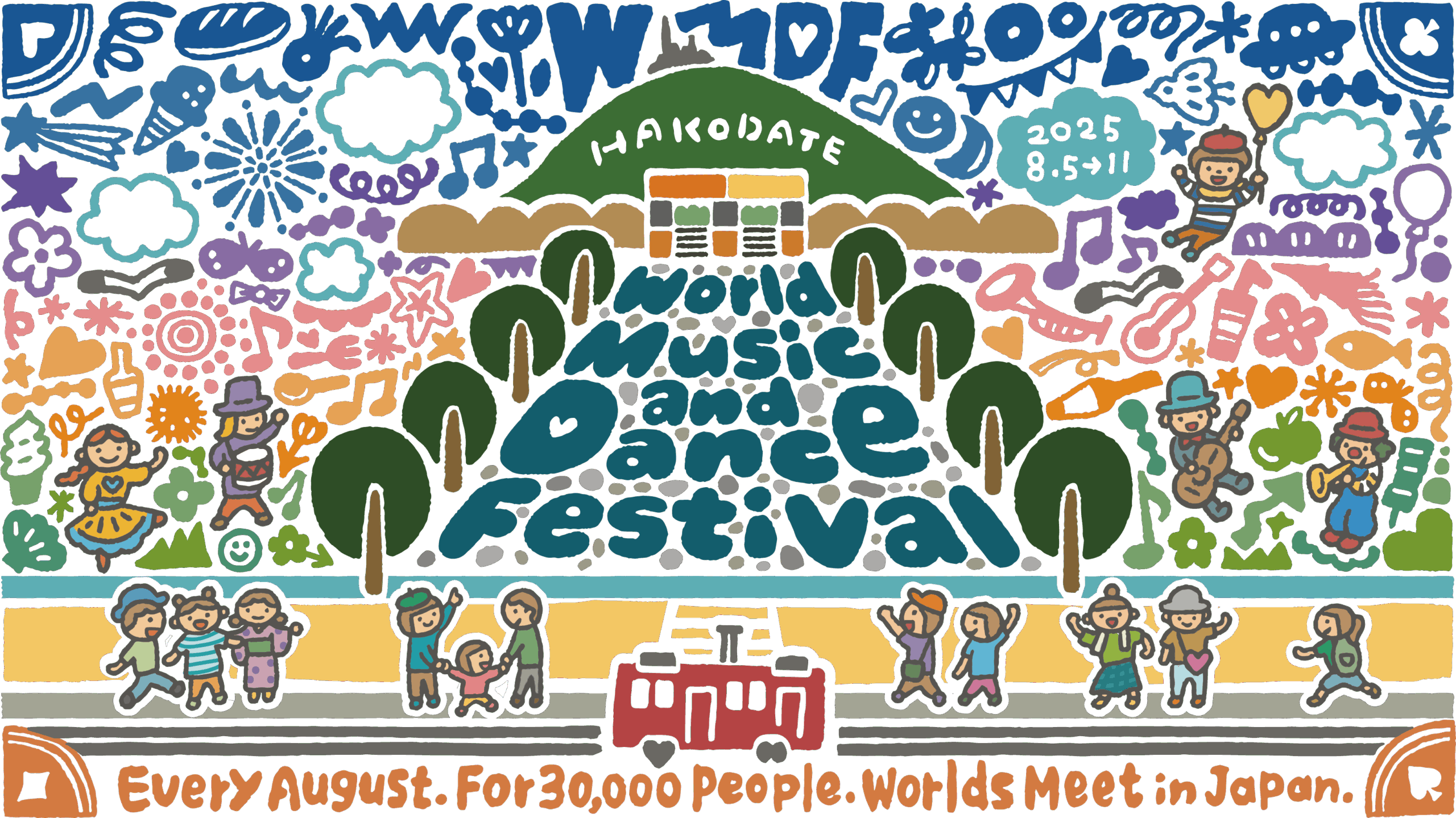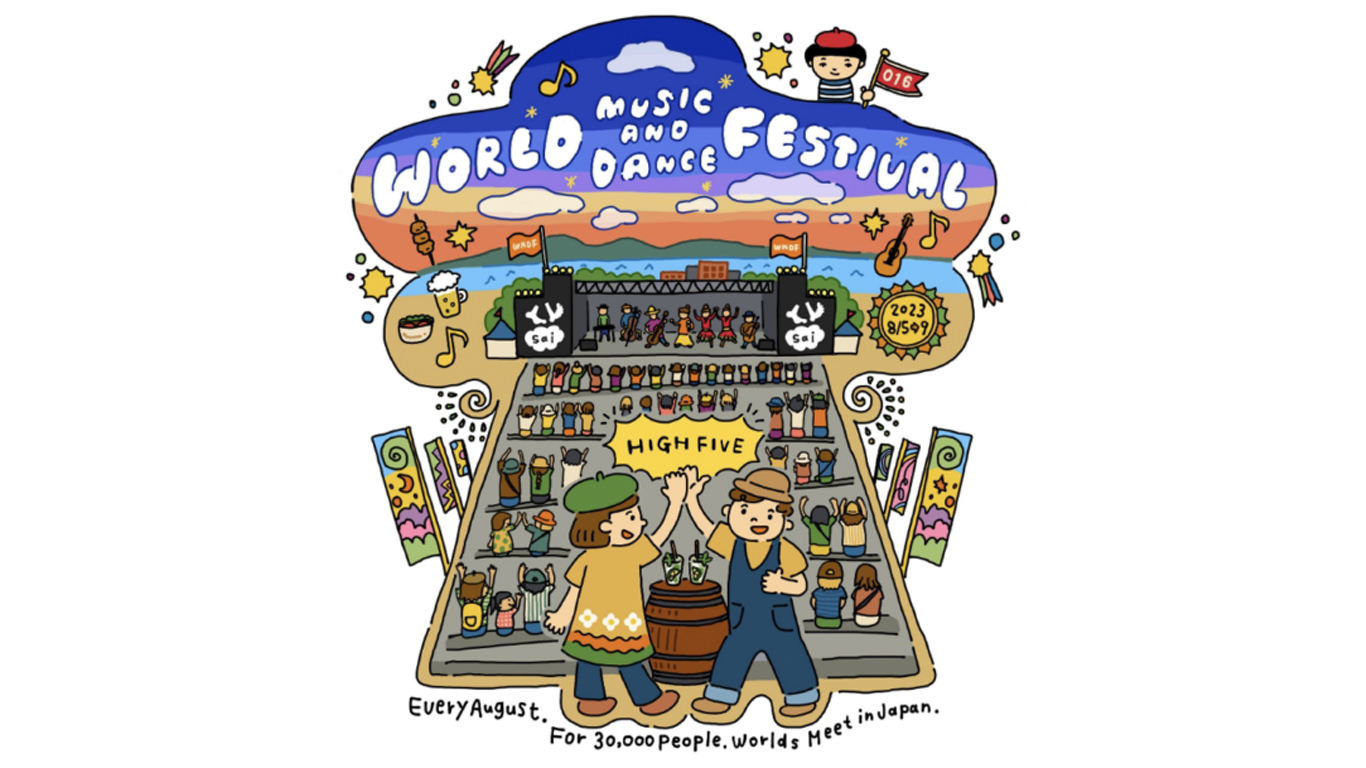 この年は、フィリピン、シンガポール、スリランカが初参加。海外アーティストには「着物デー」で特別な体験をしてもらい、地元イベントと一緒に育っていくことを目指す「Fes2Fes(フェストゥフェス)」もスタートしました。オリジナルグッズとして初めてキッズTシャツを作り完売。会場のマナーを伝える「WMDF Way」アイコンや、国・地域の参加数を3桁に伸ばすことを目指す「100プロジェクト」が立ち上がりました。函館市が「フェスティバルタウンはこだて」キャンペーンを打ち出し、まちぐるみで芸術祭を盛り上げる一歩となりました。