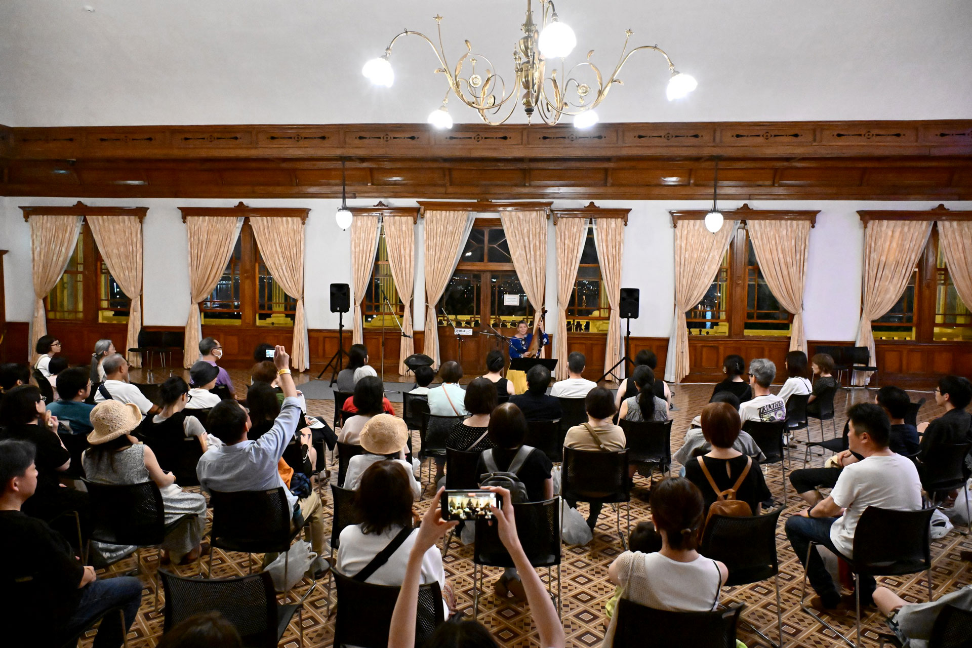 『ミシュラン・グリーンガイド・ジャポン』(仏語改定第3版)で2つ星の評価を受けたユニークな歴史的建造物、旧函館区公会堂の前で行われる特別ステージです。第005回芸術祭(2012)で生まれました。ステージといっても物理的なステージは存在しません。公会堂の前の小さな平場で、観客のすぐ目の前でパフォーマンスが行われます。照明は通常より暗めですが、公会堂のライトアップは幻想的で、私たちに神秘的な経験をもたらすでしょう。ユードラはギリシャ語の「気前のよさ、寛大さ」から来ています。